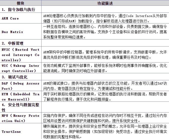 在運行過程中,ARM Core從外部存儲器(通過Code Interface)加載指令,并通過Bus Matrix和各模塊進行數據交互。