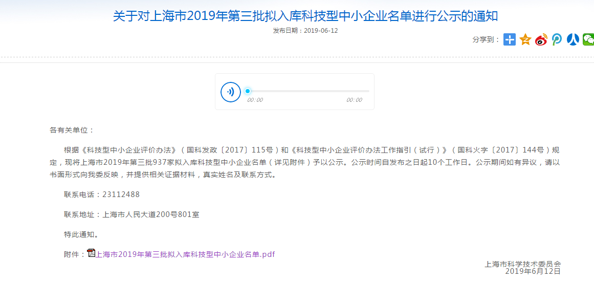 2019年6月26日,我司已過公示期正式入庫上海市科技型中小企業名單。根據科技部、財政部、國家稅務總局《科技型中小企業評價辦法》(國科發政〔2017〕115號)、科技部火炬中心《科技型中小企業評價辦法工作指引(試行)》(國科火字〔2017〕144號)要求,經區評價機構審核及市科委的批準,我司成功入庫上海市2019年第三批科技型中小企業名單。