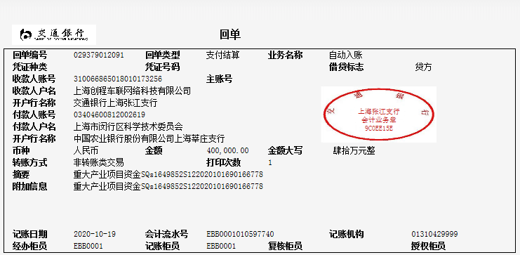 2020年8月,根據(jù)《閔行區(qū)關(guān)于推進(jìn)科技創(chuàng)新創(chuàng)業(yè)和成果轉(zhuǎn)化的政策意見》(閔府規(guī)發(fā)〔2019〕1號)及操作細(xì)則,上海創(chuàng)程“基于5G技術(shù)的智能網(wǎng)聯(lián)公交系統(tǒng)”項(xiàng)目立項(xiàng)獲得成功,10月份,我司該項(xiàng)目已通過上海市閔行區(qū)科學(xué)技術(shù)委員會的驗(yàn)收,并獲得50%項(xiàng)目經(jīng)費(fèi),共40萬元,另一半項(xiàng)目經(jīng)費(fèi)預(yù)計(jì)明年撥付。