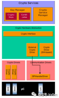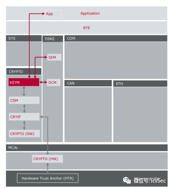 Crypto (HW)模塊作為訪問安全算法和函數的驅動程序,通過硬件信任錨(HTA)提供。有不同的HTA類型,如安全硬件擴展(SHE)和硬件安全模塊(HSM)。