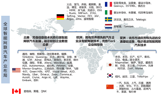 隨著車聯網產業化推進,產業鏈上下游企業紛紛進入該領域,呈現出北美信息技術引領、初創企業眾多,歐洲技術實力突出、企業加速轉型,中國企業異軍突起,亞洲市場優勢明顯,發展潛力巨大的全球車聯網產業布局態勢,全球范圍已經形成較為完整的車聯網產業鏈。