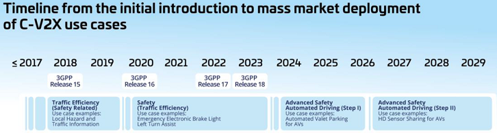 可以看到繼2020年C-V2X第一階段LTE-V2X部署應用,未來3-4年是一個發展階段。同時,針對增強安全應用和自動駕駛,業界預計將于2024-2027年開始商用部署。