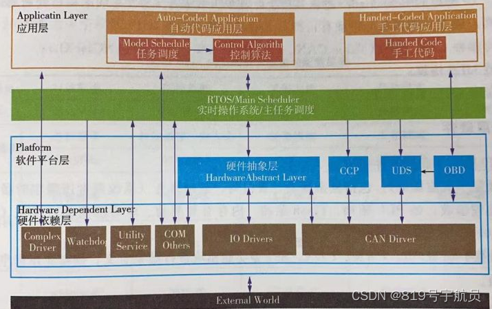 硬件依賴層(底層驅(qū)動(dòng)):包括復(fù)雜驅(qū)動(dòng)、看門狗、基礎(chǔ)服務(wù)(系統(tǒng)調(diào)度所需定時(shí)器、中斷管理和一些通用處理函數(shù),如PLL驅(qū)動(dòng)、Flash驅(qū)動(dòng)、內(nèi)存管理驅(qū)動(dòng)、定時(shí)器驅(qū)動(dòng))、IO、CAN等其他驅(qū)動(dòng)。