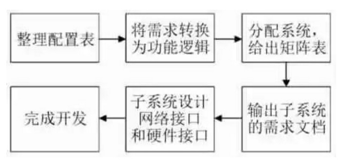 傳統EE架構的開發流程如圖1所示,由市場首先對車型定位,針對定位尋找相應的或更高配置的主流車型進行對標,主要對標其外形、內飾、靜態功能和動態功能并牽頭全員填寫競品分析表,將分析結果整合并調研用戶需求后整理輸出配置表、技術梳理配置表,找到各自的相關項,轉換為技術方案,將配置表分解為多個功能邏輯,再將功能邏輯分配給多系統,輸出網絡通信需求表,根據需求表,輸出子系統的需求文檔,文檔中寫明I/O、人機交互界面、性能要求、應用場景等,子系統根據功能分配自己的網絡接口和硬件接口,最后完成系統的原理圖和網絡開發。