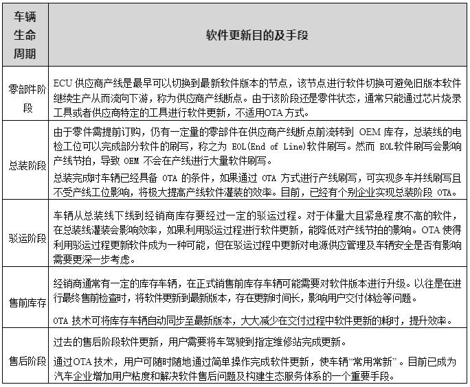 表 2-1 車輛生命周期維度的軟件更新應用