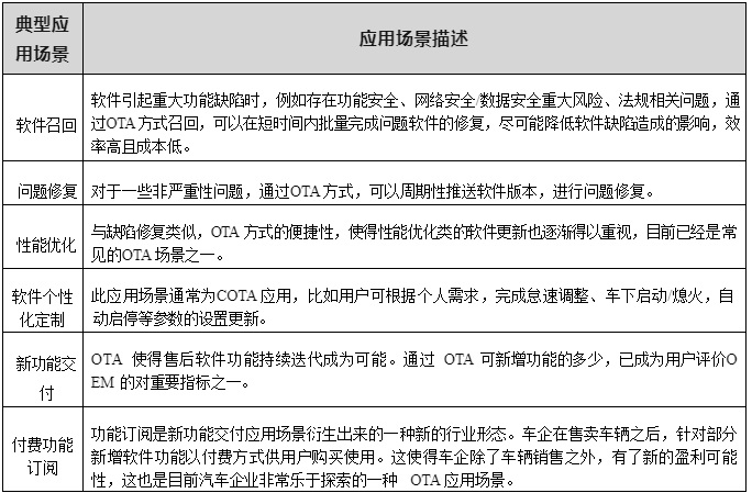 從軟件運營管理的維度 OTA 的典型應用場景如下表 2-2 所示。
