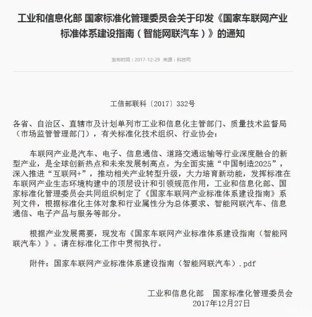 日前,工業(yè)和信息化部國(guó)家標(biāo)準(zhǔn)化管理委員向各省、自治區(qū)、直轄市及計(jì)劃單列市工業(yè)和信息化主管部門、質(zhì)量技術(shù)監(jiān)督局(市場(chǎng)監(jiān)管管理部門),有關(guān)標(biāo)準(zhǔn)化技術(shù)組織、行業(yè)協(xié)會(huì)下發(fā)了《國(guó)家車聯(lián)網(wǎng)產(chǎn)業(yè)標(biāo)準(zhǔn)體系建設(shè)指南(智能網(wǎng)聯(lián)汽車)》的通知。