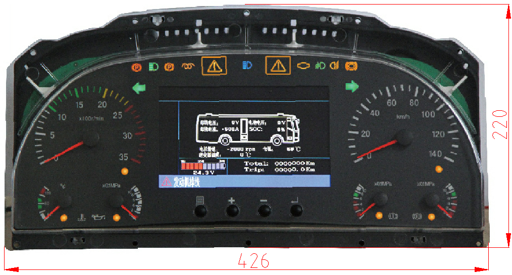 - 6個步進電機驅(qū)動的指針表盤 - 19個LED符號片 - 多個TFT符號片 - 7寸TFT彩色液晶屏 - 一個多音頻蜂鳴器 |