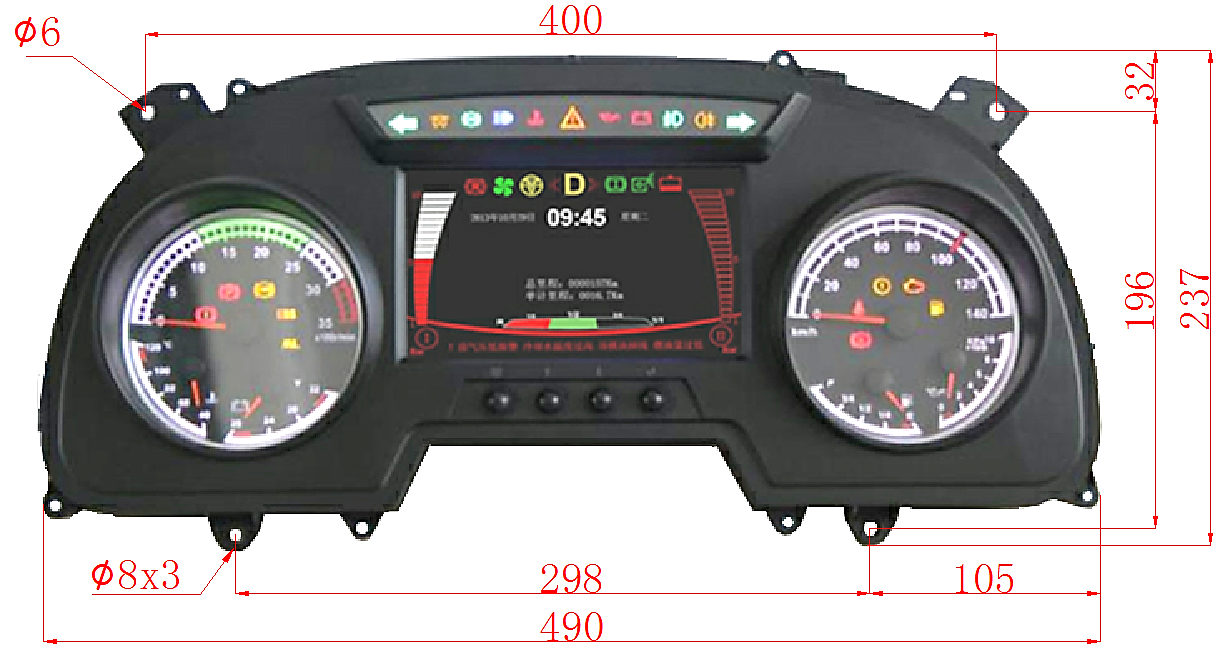 - 6個(gè)步進(jìn)電機(jī)驅(qū)動的指針表盤 - 24個(gè)LED符號片 - 多個(gè)TFT符號片 - 7寸TFT彩色液晶屏 - 一個(gè)多音頻蜂鳴器 |