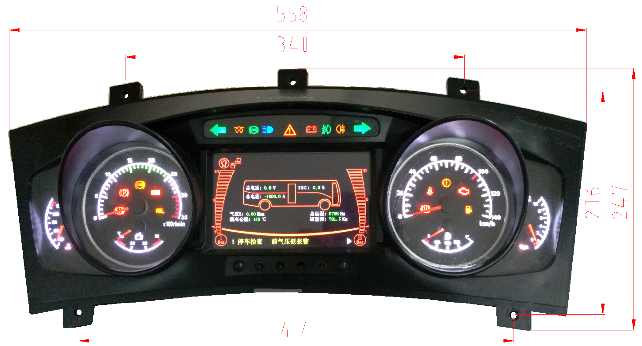 - 6個步進電機驅動的指針表盤 - 19個LED符號片 - 多個TFT符號片 - 7寸TFT彩色液晶屏 - 一個多音頻蜂鳴器 |